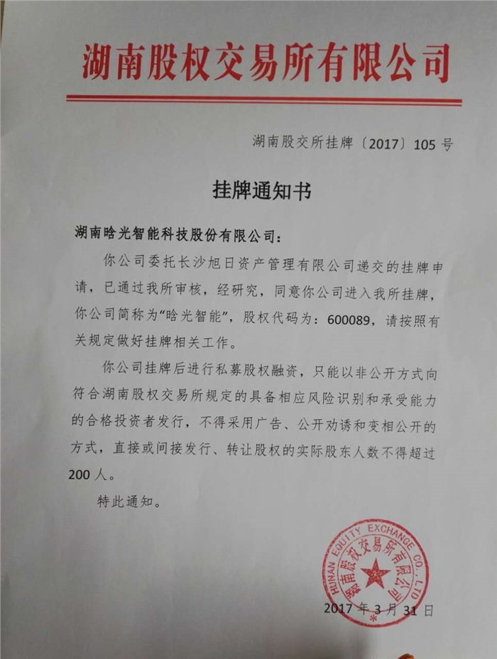 湖南晗光智能科技股份有限公司于3月31日在湖南股權交易所成功掛牌四板(標準版),掛牌儀式擇日舉行。